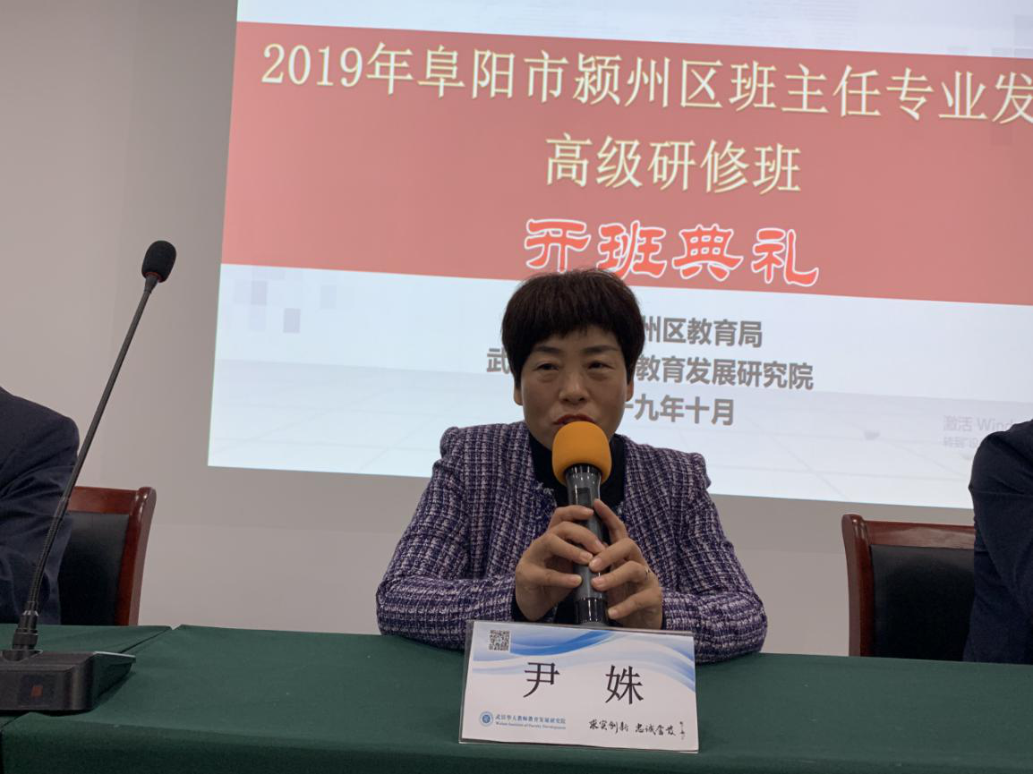接着,阜阳市颍州区教育局基教股尹姝股长指出,班主任培训是新时代贯彻党的教育方针,顺应时代的要求,加强未成年人思想建设的迫切需要,是全面实施素质教育,有效提高教学教育质量的要求,是促进班主任专业化发展的重要途径。并对在座班主任提出三点要求: