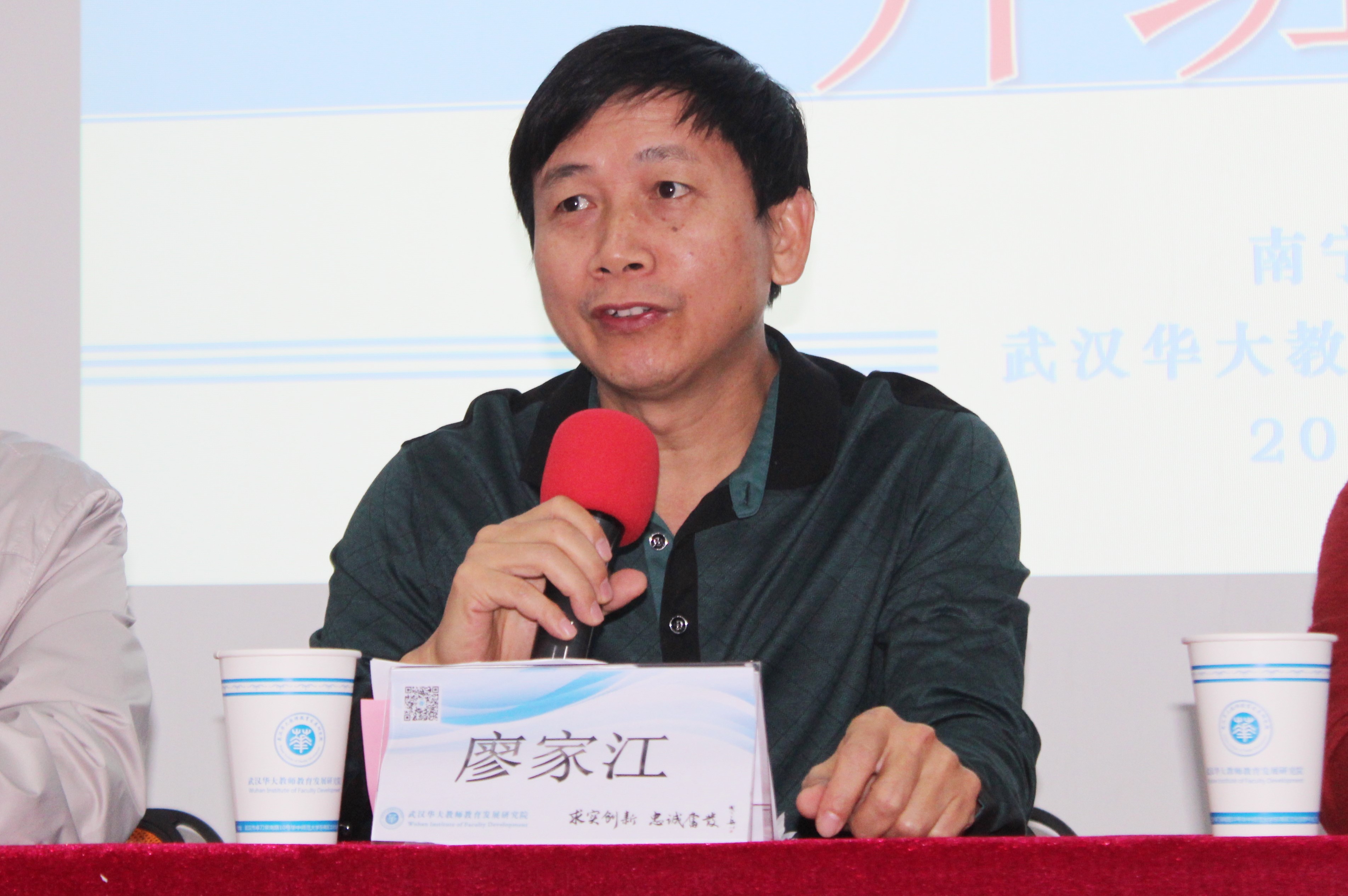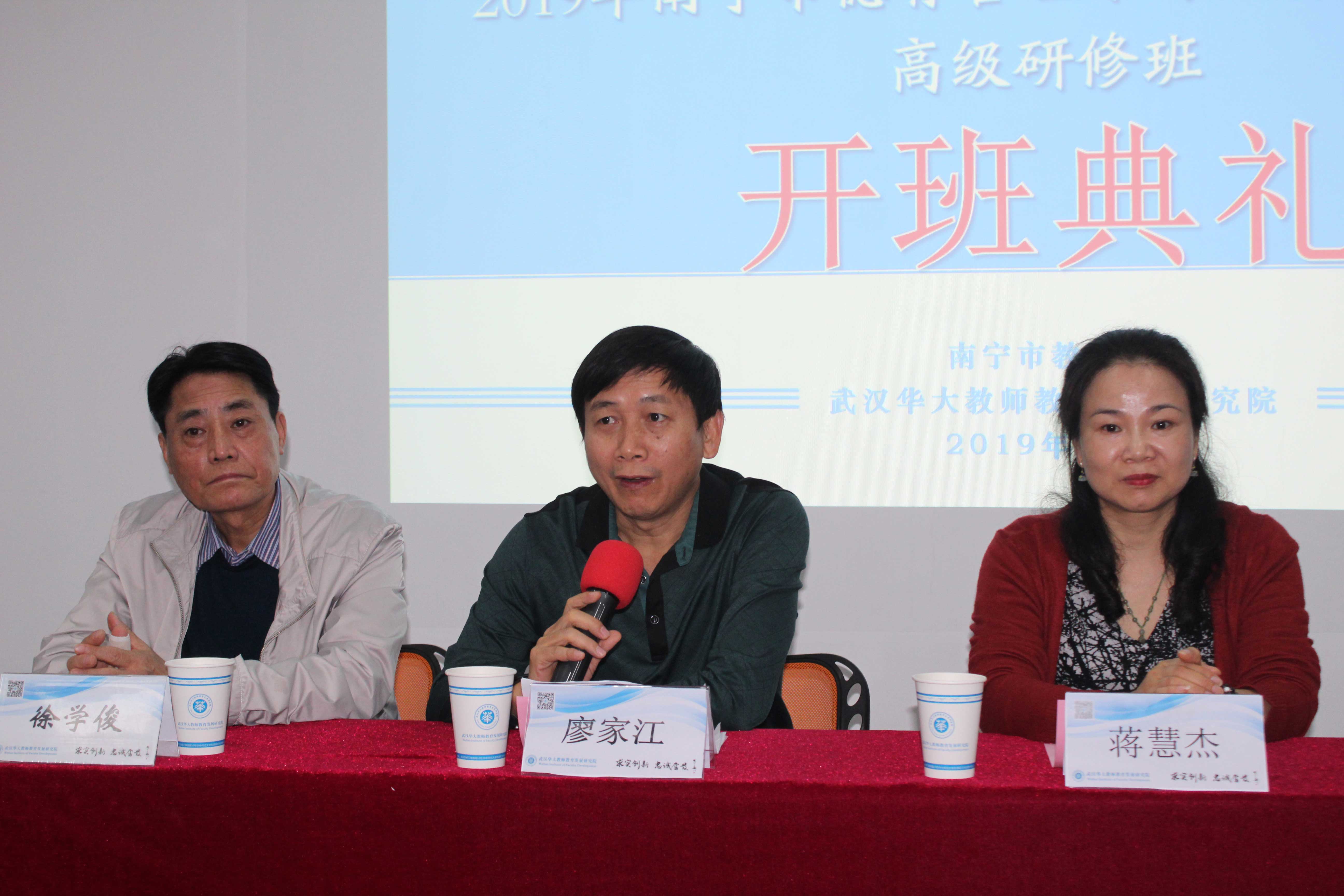 随后,南宁市教育局基教科主任科员廖家江讲话他说“这次集中培训主要是想让大家开拓新视野,开拓新思维,通过专家引领话德育,群英荟萃论德育,经验分享享德育,高屋建瓴展德育等多种方式来提高德育干部的规划能力、管理能力执行能力和创新能力,以促进自身能力提升和学校德育特色发展 ,希望大家能够珍惜这次学习的机会,明确学习的目标,做到有的放矢,带着目标来学习。其次,一定要严守纪律,强化自我管理,沉下心学习,完成从领导到学员身份的转换。
