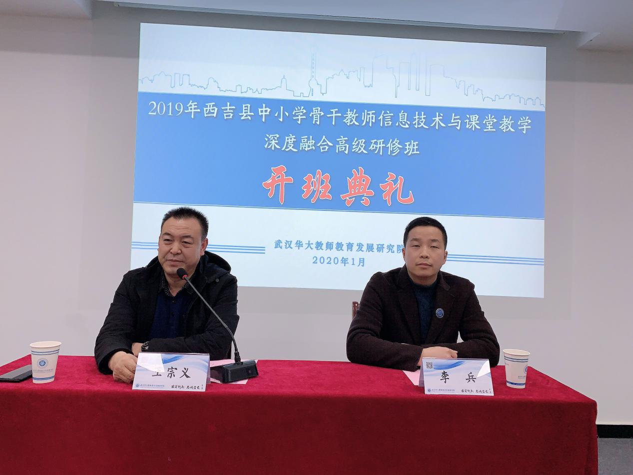 2020年1月13日下午14:00时,由西吉县教育体育局主办,我院承办的2019年西吉县中小学骨干教师信息技术与课堂教学深度融合高级研修班开班典礼在华大教研院博文厅顺利举行。来自西吉县个各中小学的54名骨干教师齐聚一堂,开展为期8天的培训学习。西吉县教师发展中心主任王宗义、我院院长李兵出席了开班仪式。