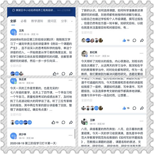 据了解,此阶段培训以“创新课题研究思维,提升课题研究能力”为主题,延续了线上授课的形式,将专题讲座与专家在线研讨在线结合,为各位学员提供学习、研讨、提升的平台。通过一天的学习,学员们纷纷表示此阶段的培训课程结合了大家的实际工作需要,虽然部分老师已经处于复学复课阶段,但老师们依然能在忙于工作的间隙还兼顾好培训学习,为了保证学习任务能高效完成,部分老师在课后特地反复学习,并在班级学习圈积极分享学习的心得感受,只为将所学所悟融入到实际教育科研工作中。此外,培训还设置了小组任务和个人学习任务,通过撰写优质的论文,将优秀教学成果转化为优秀科研成果,从而以优质成果做导向,充分发挥辐射推广作用。