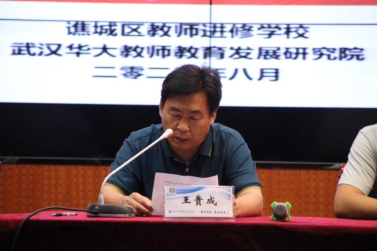 第一项议程,谯城区教育局副局长王贵成发表讲话。王局长谈及:促进信息技术与教育深度融合、加速构建一体化“互联网+教育”平台是落实教育部《教育信息化2.0行动计划》的政策要求,也是学校信息化建设、教师信息素养提升的重点。王局长指出,教育局对本次培训寄予了高度重视,制定了详细严明的培训计划,希望各位参训教师能够重视此次培训,精心学习,掌握先进技术,提升信息技术应用能力,力求达到提升管理团队信息化领导力、教师团队信息化教学能力、培训团队信息化指导能力的目标。
