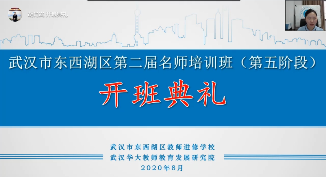 在这个特殊的庚子年处暑日,822的下午13:30本次以线上研修学习为主的“2020年东西湖区第二届名师培训班(第五阶段)”正式拉开序幕。东西湖教师进修学校师训科科长朱艳红、我院执行院长徐学俊以及东西湖区名师培养班各位学员齐聚云端”直播间,以钉钉直播会议形式远程参加了本阶段学习的线上开班典礼。
