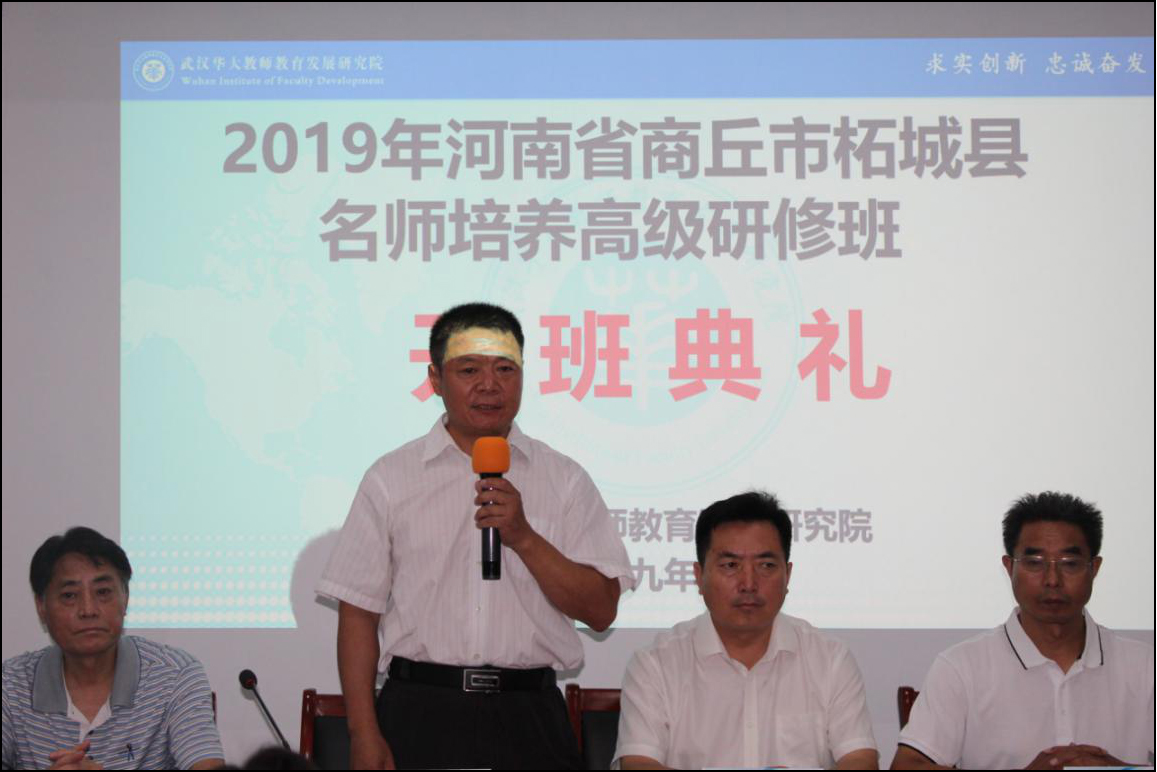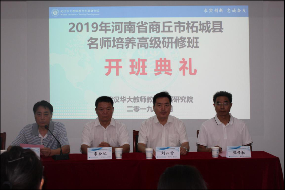 2019年7月14日上午08:30分,2019年河南省商丘市柘城县名师培养高级研修班开班典礼在华大教研院博学厅如约而至。柘城县教育体育局教育股股长李金状、柘城县基础教研室主任刘西堂、柘城县教师进修学校副校长张传松、我院执行院长徐学俊,及柘城县77位名师参加了本次开班典礼。