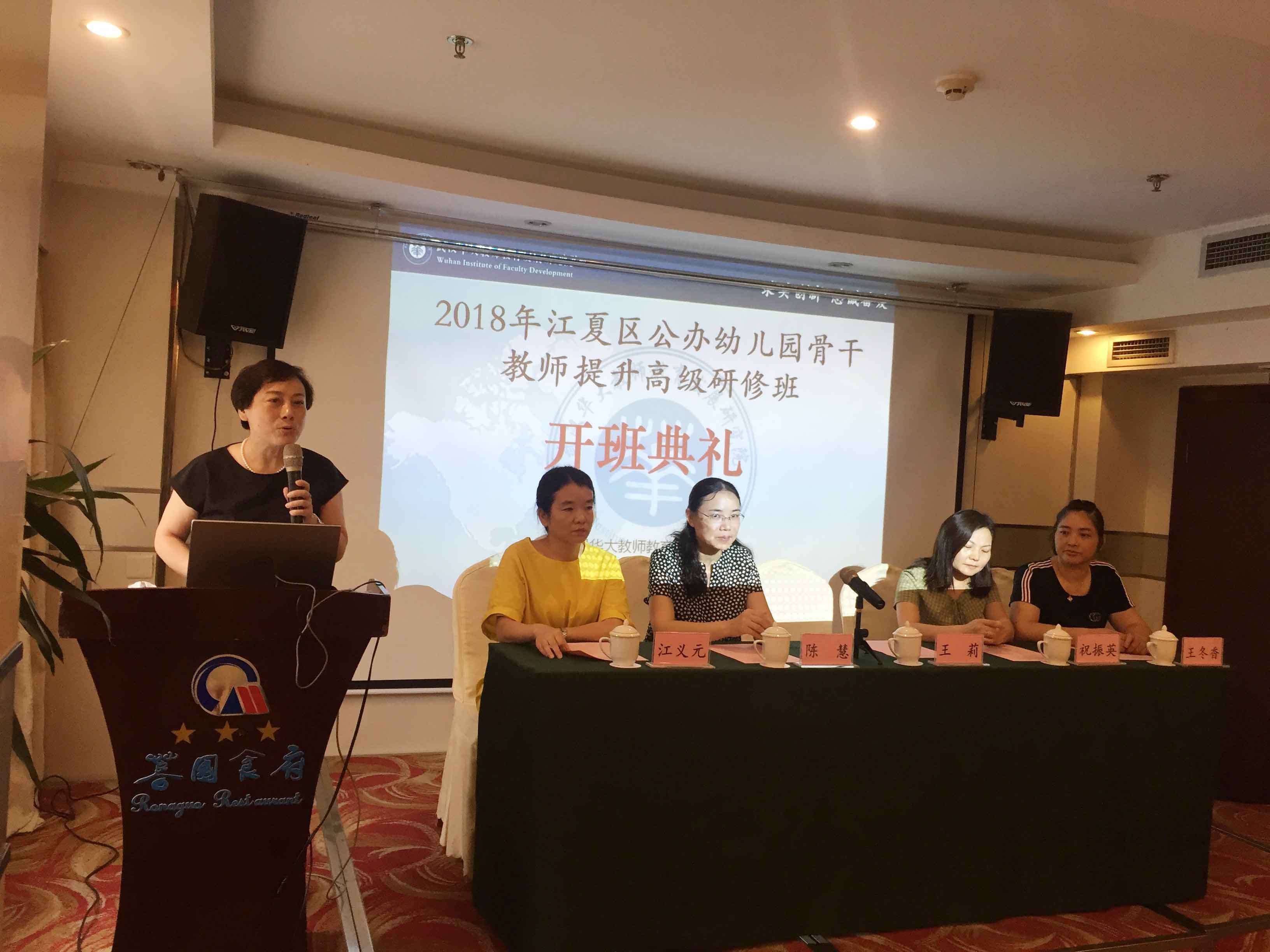 7月4日上午8点30分,由武汉市江夏区中心幼儿园、江夏区东湖路幼儿园、江夏区明熙幼儿园、江夏区实验幼儿园、江夏区第一幼儿园、江夏区郑店中心幼儿园联合主办,我院承办的“2018年江夏区公办幼儿园骨干教师提升高级研修班”开班典礼在成都市芙蓉酒店四楼白芙蓉厅会议室顺利举行。江夏区中心幼儿园园长王莉、江夏区东湖路幼儿园园长任贤梅、江夏区明熙幼儿园园长陈慧、江夏区实验幼儿园祝振英、江夏区第一幼儿园王冬香、江夏区郑店中心幼儿园园长江义元以及来自六所幼儿园的60位优秀骨干教师参加了此次开班典礼。开班典礼由班主任刘老师主持。