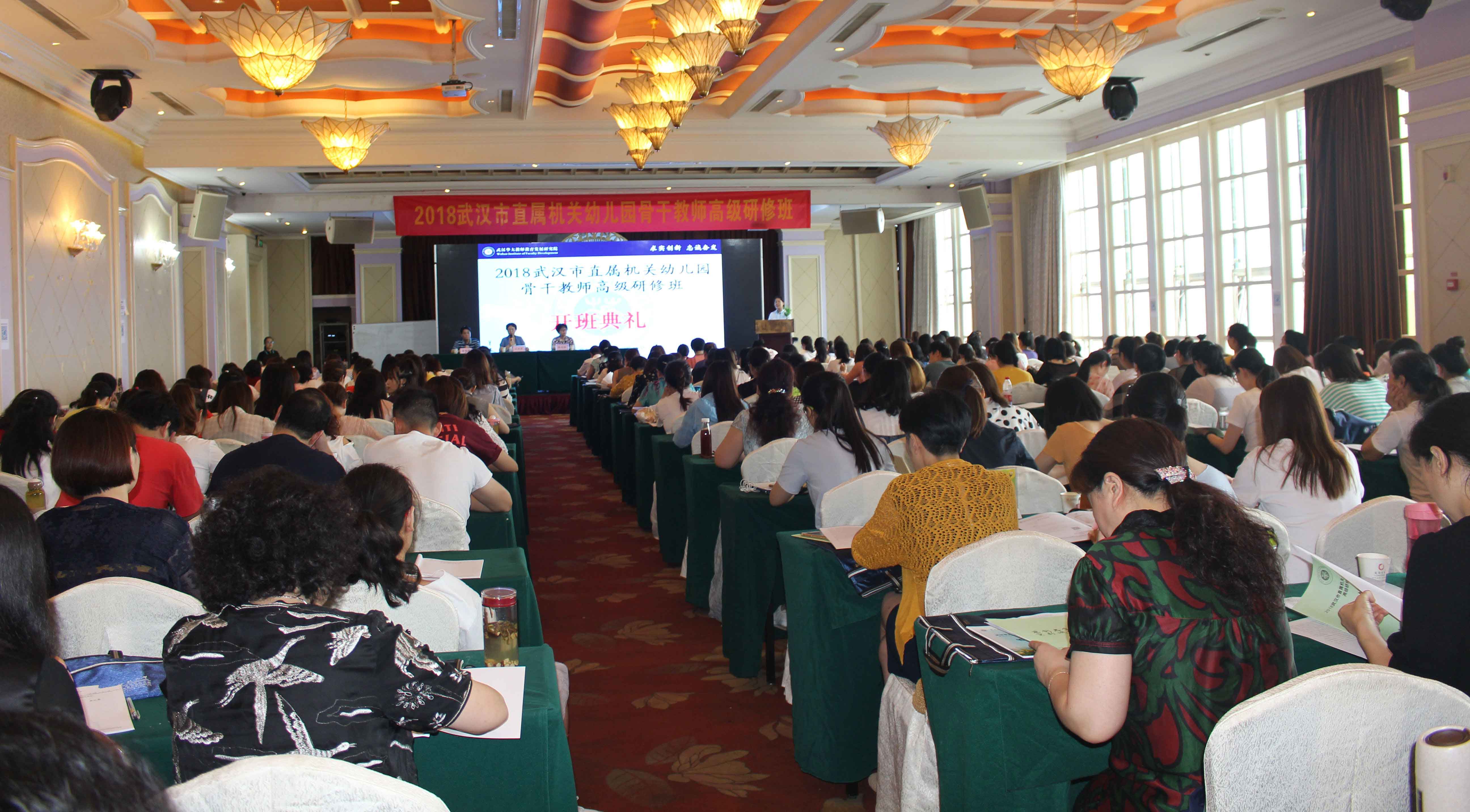 国运兴衰,系于教育;教育振兴,全民有责。为加快推进武汉市直属机关幼儿教师素质教育进程,尽快建立一支高素质的、能适应教育教学改革的教师队伍,7月6日上午8时30分,由武汉市直属机关幼儿园管理处主办,我院承办的“2018武汉市直属机关幼儿园骨干教师高级研修班”在秀色宜人的江滩艾森豪酒店六楼会议厅顺利举行。武汉市直属机关幼儿园管理处处长万双霞、武汉市华大教师教育发展研究院执行院长徐院长、华中师范大学教育学院副院长、博士生导师蔡迎旗教授、以及来自各机关幼儿园领导和217名学员参加了此次开班仪式,开班典礼由班主任刘老师主持。