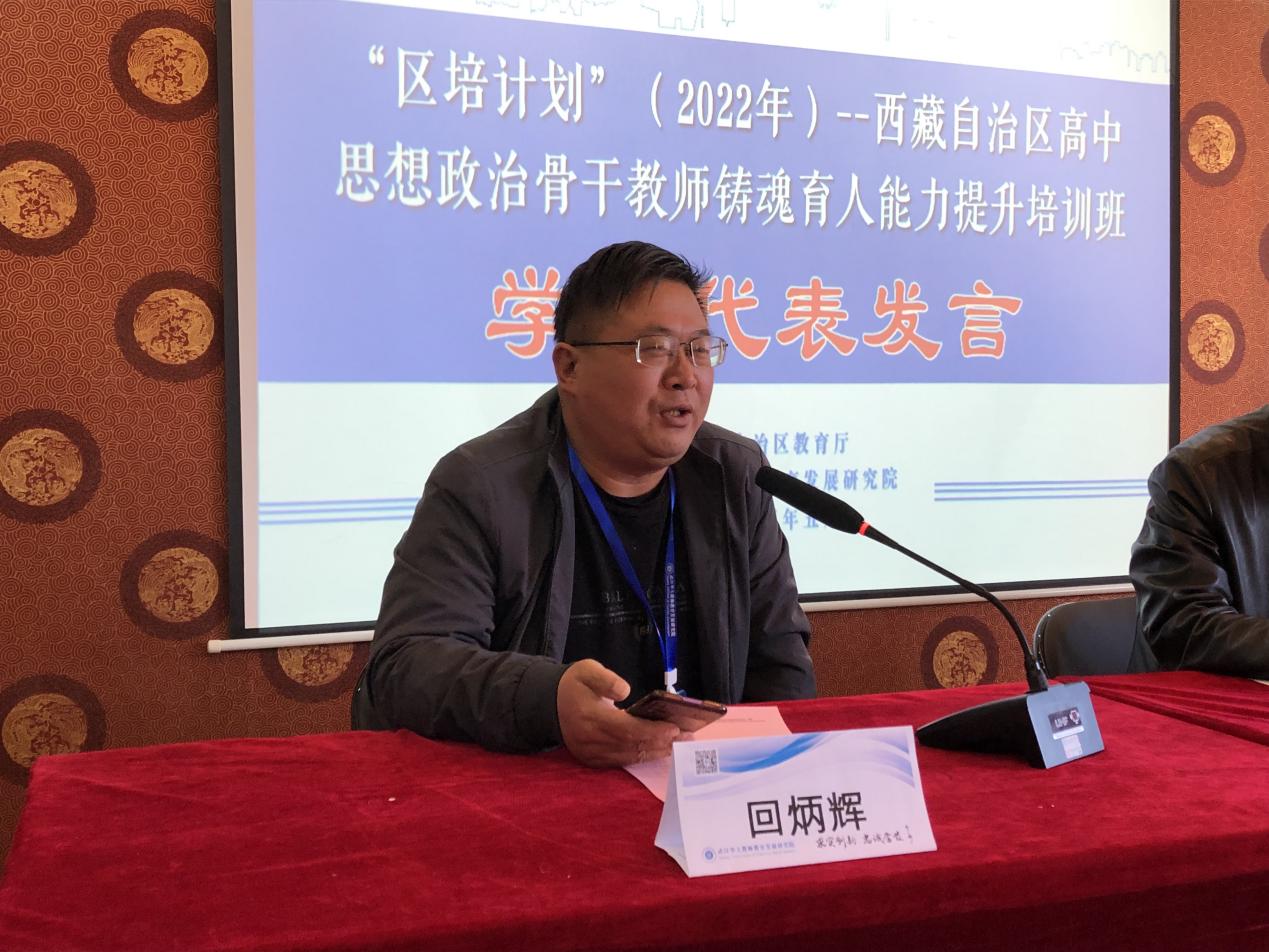 来自林芝市第二高级中学,培训班支部书记回炳辉老师作为学员代表发言,“天之足,利而不害,人之道,为而不争,老师做一切该做的事情而不与民争名夺利!”回老师与全体学员共勉,并从求同、求教与求学三个方面表态培训中将全力确保思想正确,没有政治风险;树立全局意识,服从大局,团结协作;潜心问道,教学相长,认真完成培训任务,做教书育人的大先生。