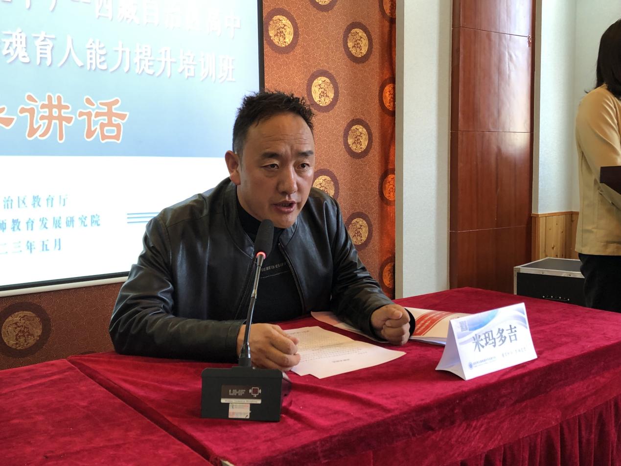 米玛多吉强调党的二十大提出落实立德树人根本任务,思政课是落实立德树人根本任务的关键课程,是铸魂育人的主渠道。新时代以来党中央高度重视思政课建设,2019年3月习近平总书记专门召开了学校思想政治理论课教师座谈会,并在会上要求思政课教师“政治要强、情怀要深、思维要新、视野要广、自律要严、人格要正”,西藏自治区党委、教育厅党组高度重视学校思想政治课程建设及思政教师队伍建设,希望全体学员明确培训目标,促进自身发展;珍惜培训机会,专心学习,高标准、高质量完成好培训学习;加强管理,搞好服务,确保培训质量。