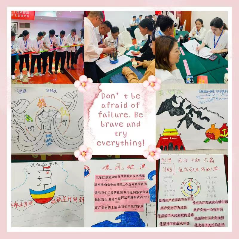 最后,在班主任胡老师的主持下,开展以《不忘初心,牢记使命》为主题的团建破冰活动。破冰活动以四个流程开展:组建团队--红歌颂党,走进队伍;团队建设--敞开心扉,走近你我;能量传递--红心向党,走向卓越;团队展示--党旗飘扬,党徽闪耀;全体学员以红歌小组建立5个团队,发挥团队智慧,确立小组口号、组建队名、并绘制队徽,通过团结合作彼此熟悉,通过团队展示彼此融入。团队展示有象征民族团结的石榴队,有体现女性力量的“红色娘子军”,有努力逐梦前行的梦想队,有砥砺前行的扬帆起航队,以及乘风破浪勇毅前行的乘风队,都精彩展示出了西藏幼教人的团结一心、积极向上、热衷教育的优秀风貌。
