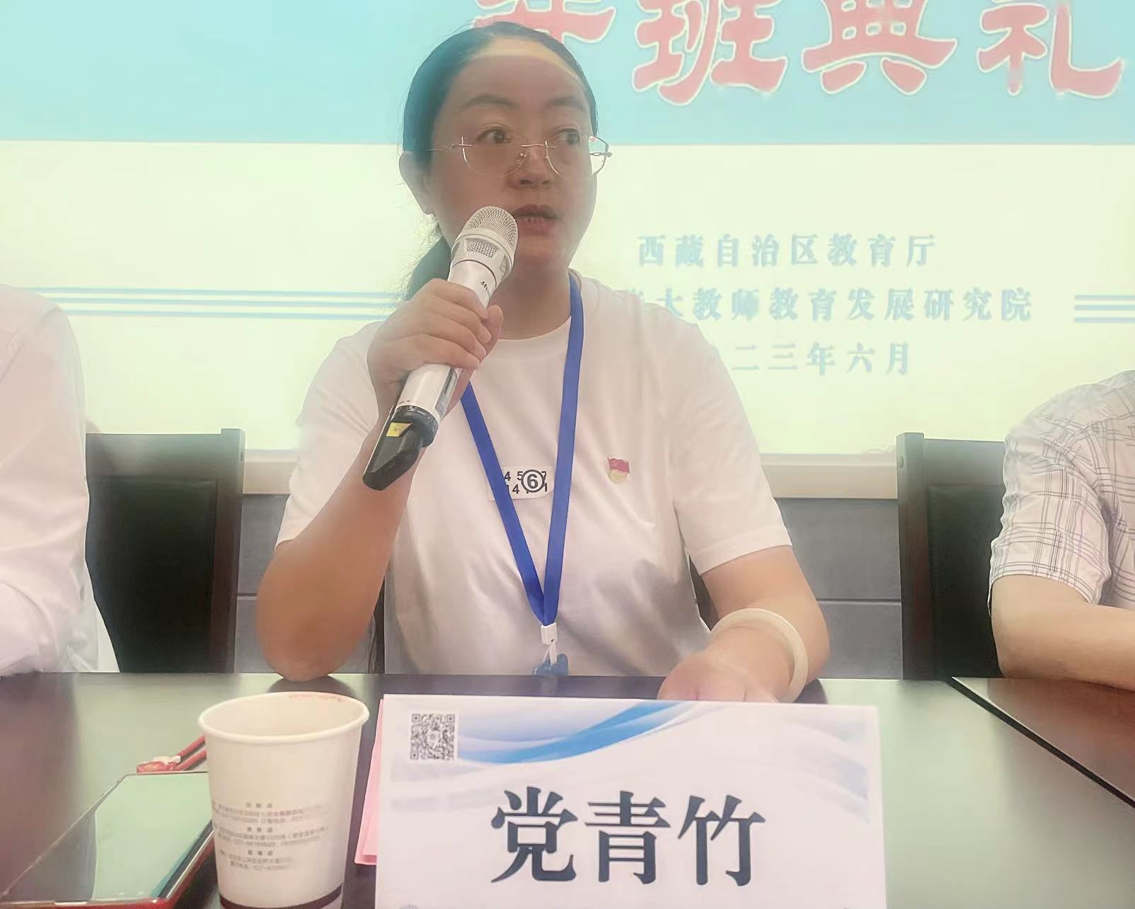 林芝市察隅县察瓦龙乡中心小学党支部书记党青竹指出,本期研修班是在深入学习贯彻党的二十大精神,坚持和加强党对中小学校的全面领导,稳慎推进建立中小学校党组织领导的校长负责制的大背景下举办的,受到西藏自治区教育厅的高度重视,力求体现出高端、前沿的站位和示范、引领的品位。并对参训学员提出三方面要求,第一,充分认识举办研修班的重要意义,增强学习的自觉性和紧迫感,切实加强党建理论武装,提升党建能力本领;第二,准确把握研修班的主要任务,主动了解课程安排,精准对标成果要求,高标准、高质量投入研修学习。第三,切实保证研修班的学习效果,在理论辅导与实践指导中丰富综合素养,在同伴研讨分享中加强互促共进。党书记强调,希望各位学员既能在研修过程中静下心来专心学,确保培训收获最大化,也能在回到工作岗位后,更好地推进党的全面领导在基层学校的落实,助推小学校领导体制改革工作,充分发挥国培学员的示范引领作用,以高质量党建引领推动办学治校高质量发展。