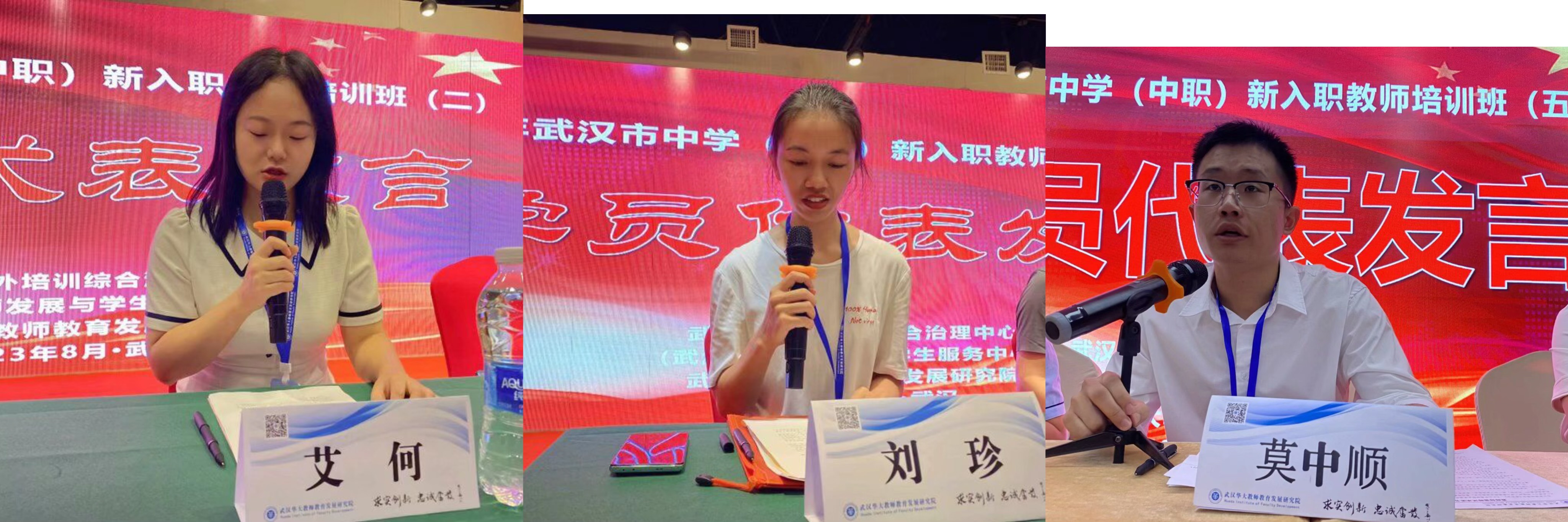 学员代表刘珍老师、艾何老师、莫中顺老师代表全体学员发言,三位老师表示“感谢武汉市教师发展与学生服务中心为全体新教师提供本次宝贵的学习机会,“为师之道,端品为先;学高为师,身正为范”,作为一名新教师,在人生的新起点上,我们渴望成为一名优秀的人民教师,然而,面对新的工作环境,我们又感觉到压力大,责任重,同时,也深知自己还存在着许多不足,教学经验有待丰富,知识领域有待扩展,知识结构有待完善,期望能通过本次学习平台和名师深度对话,和同行研讨交流,在夯实专业基础的同时,提升教育教学的实践能力,选择教育是我们青春路上无悔的铮铮誓言,我们将用智慧和热情去实现一生的承诺,用青春和爱心去诠释教育的真谛,履行教师的神圣职责,为武汉教育高质量发展贡献力量。”