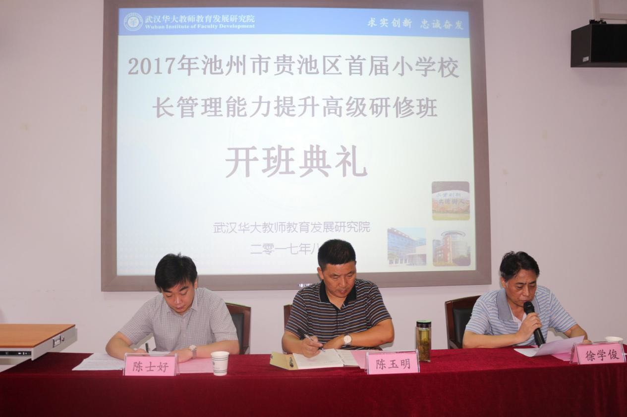 8月26日上午八点半,由贵池区教育局主办,武汉华大教师教育发展研究院承办的“2017年池州市贵池区首届小学校长管理能力提升高级研修班”开班典礼在华中师范大学学术交流中心北楼顺利举行。参加此次开班典礼的有贵池区教育局人事科科长李建华、贵池区职教中心校长陈玉明、贵池区殷汇中心学校校长陈士好、武汉华大教师教育发展研究院副院长徐学俊,以及来自贵池区各个小学的校长们。开班典礼由班主任胡肖岚老师主持,胡老师详细介绍了出席典礼的领导及嘉宾,并宣布本次培训班开班典礼正式开始。