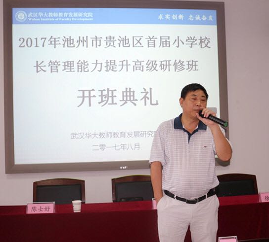 开班典礼由徐学俊副院长致欢迎辞。首先,徐院长向前来参加培训的各位学员表示了热烈的欢迎,他指出,近年来,党和国家都非常重视基础教育,党的十八大报告提出了“努力办好人民满意的教育”,而小学教育对于基础教育乃至教育事业的整体发展具有重大影响。此次举办的“2017年池州市贵池区首届小学校长管理能力提升高级研修班”既是贯彻落实《国家教育和改革发展规划纲要》的具体体现,也是提升校长队伍素质、促进全市教育内涵发展、均衡发展和创新发展、推进基础教育课程改革纵深发展的重要举措。因此,徐院长表示,希望大家倍加珍惜这次宝贵的学习机会,尽快实现从“领导者到学员”的身份转换,抛开工作、家庭的牵绊,沉下心来,互相学习,取长补短,力争学有所获,学有所得,学有所乐。最后,徐院长对此次培训任务的承办方——武汉华大教师教育发展研究院进行了简单介绍,他指出,本次培训工作将以优质、精干的工作队伍全力投入,切实做到以人为本,规范管理,温情服务,以确保培训取得实效,让领导放心,让学员满意。